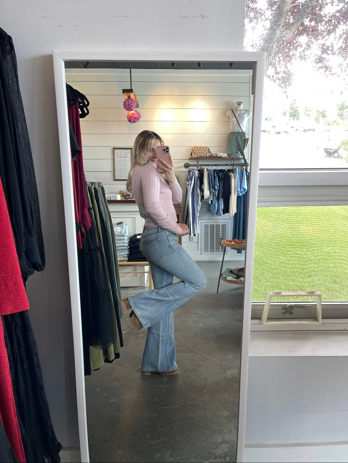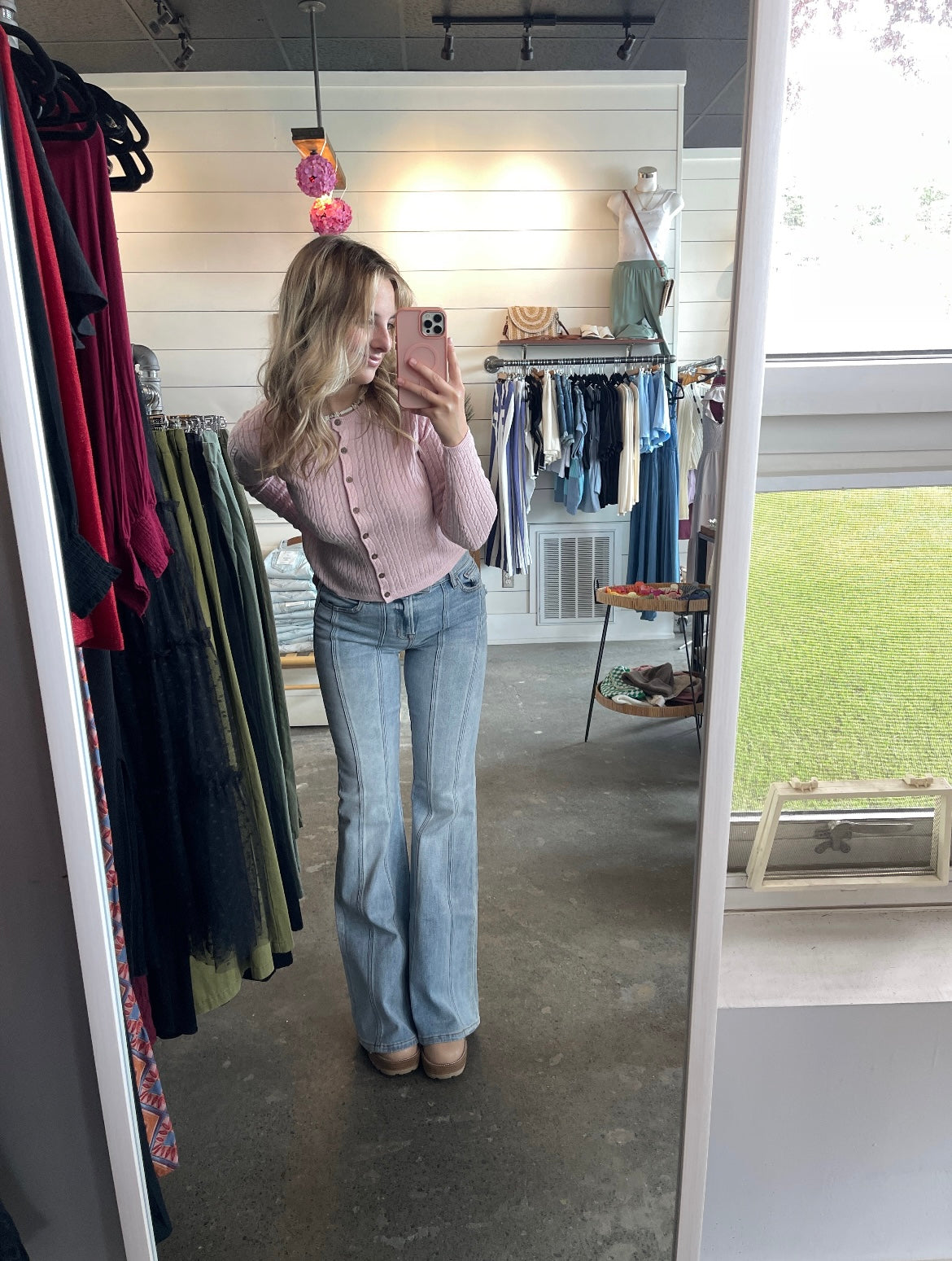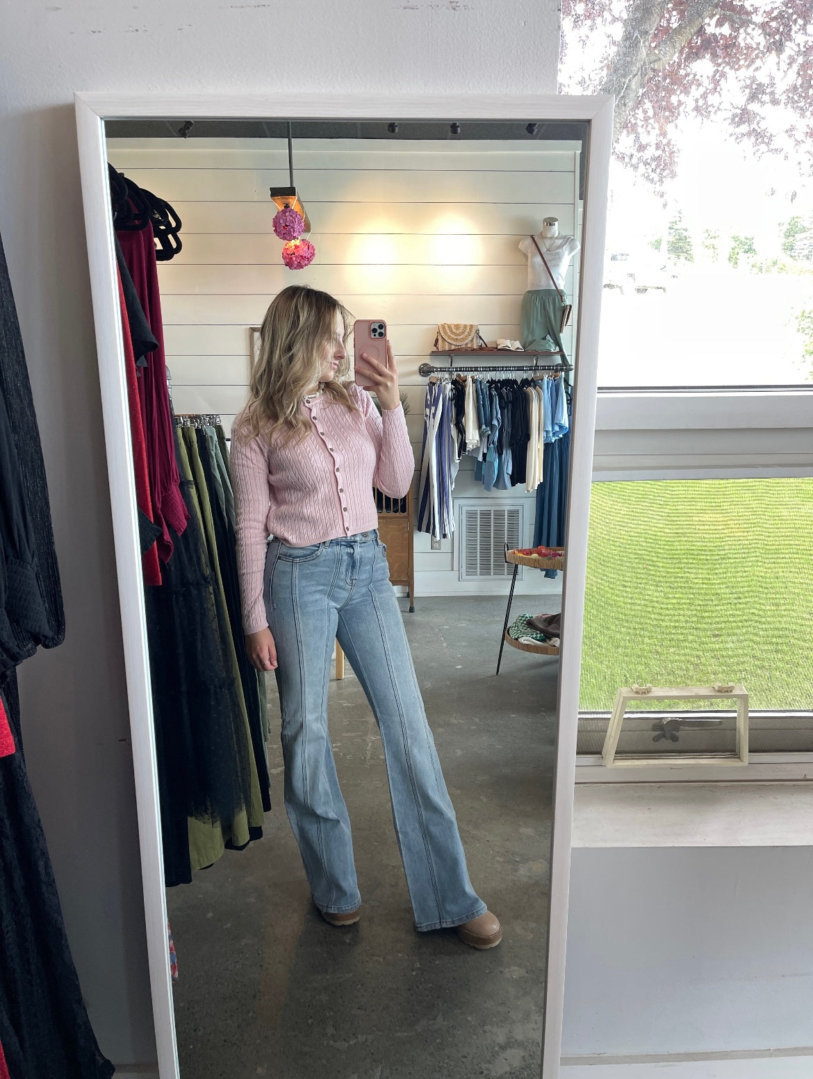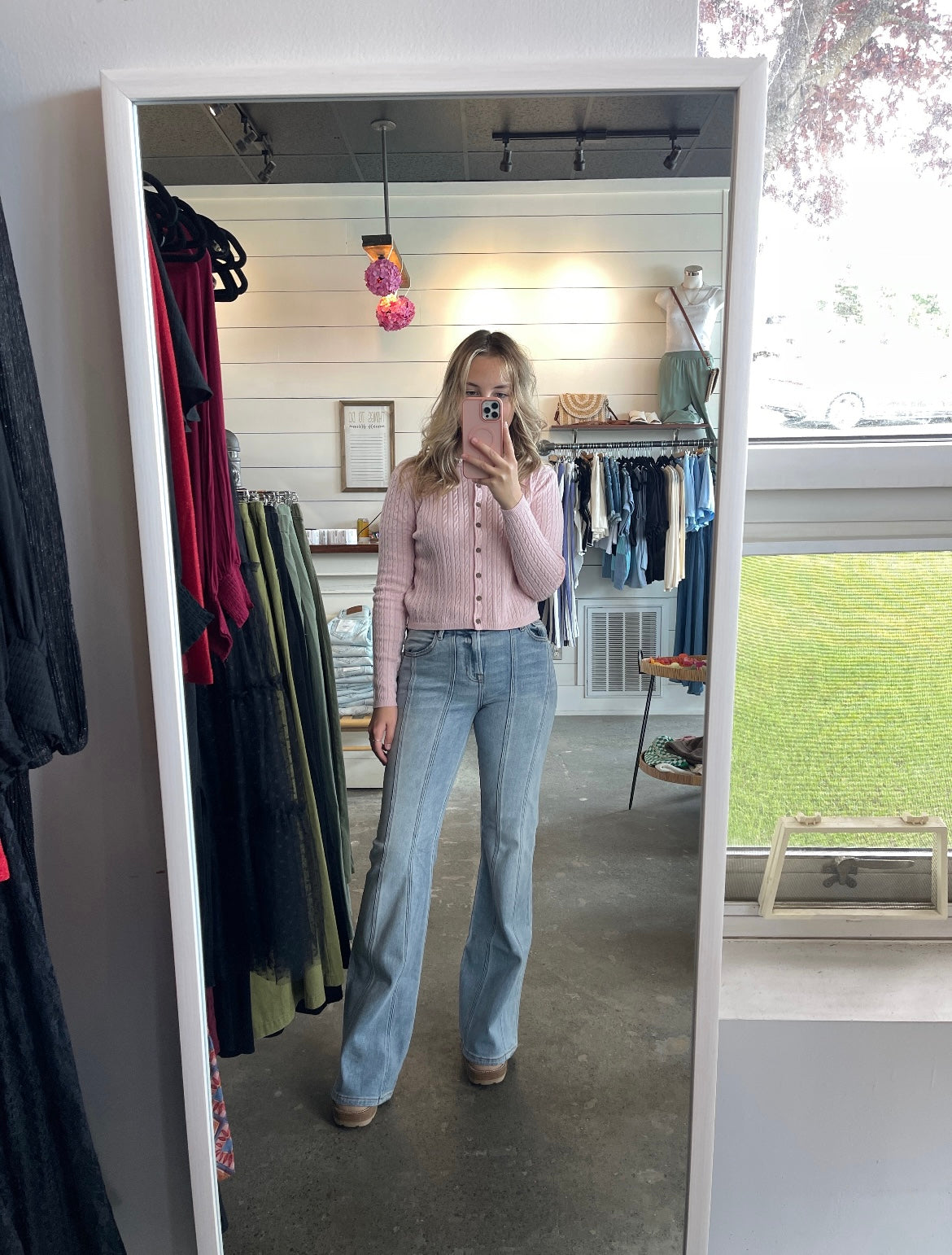 Hidden light wash 33” inseam high rise moto accent front seams flare