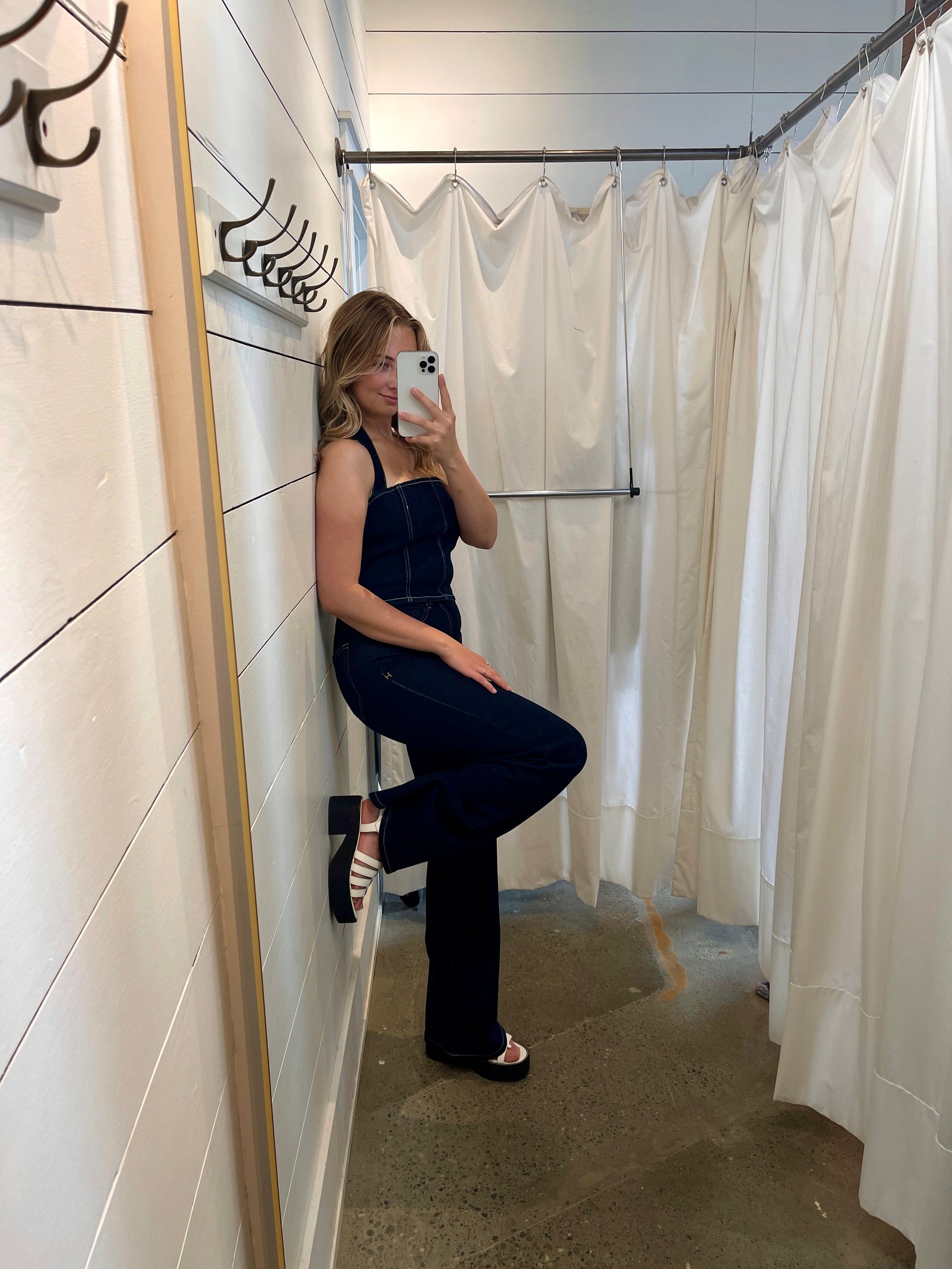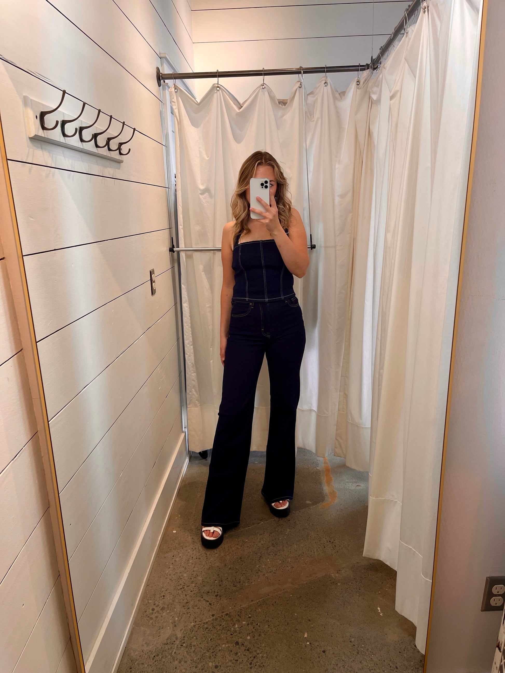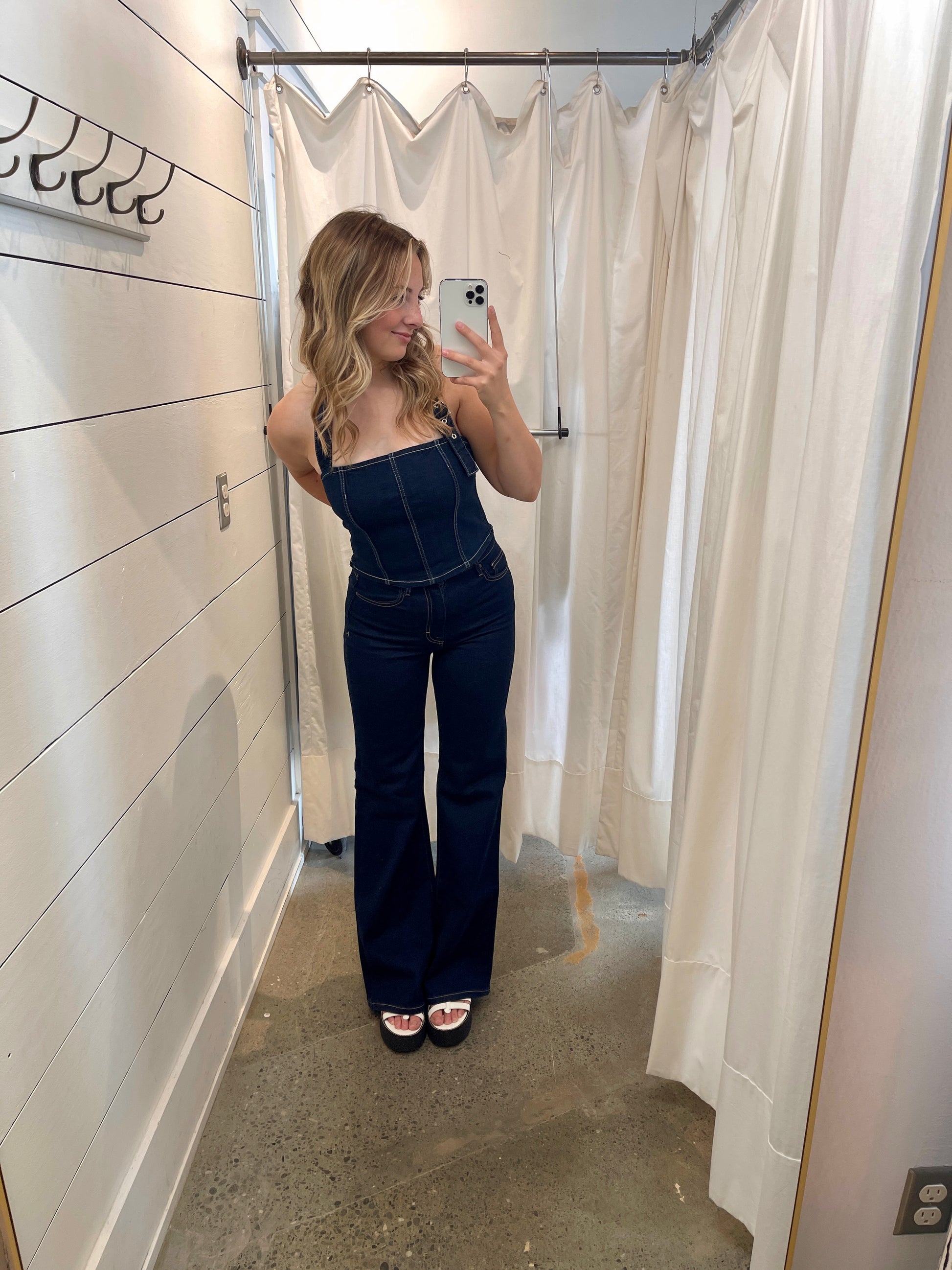Hidden dark rinse wash high rise 33” inseam wide leg stretch flare