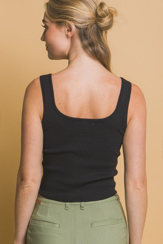 Stretchy square scoop neck cropped tank with 3D floral embelishments