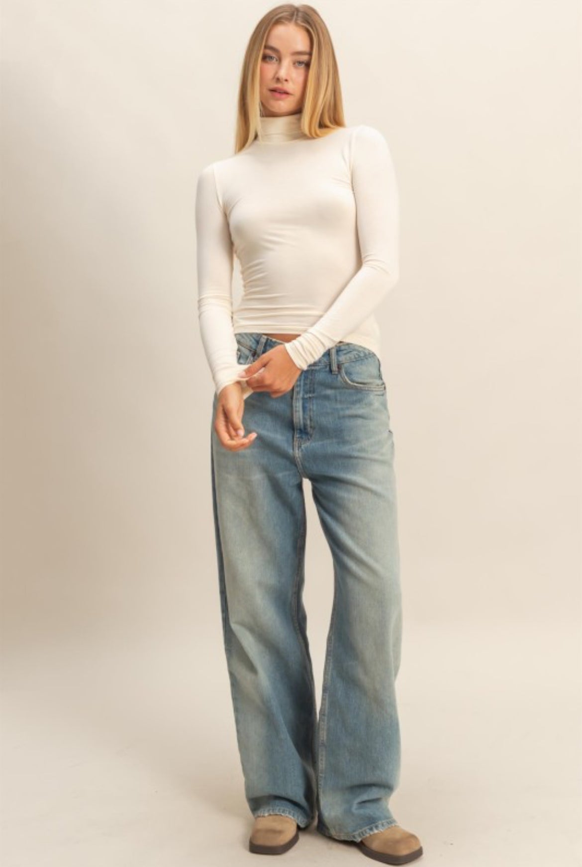 Fitted mock turtleneck stretchy thin basic long sleeve layering classic length top